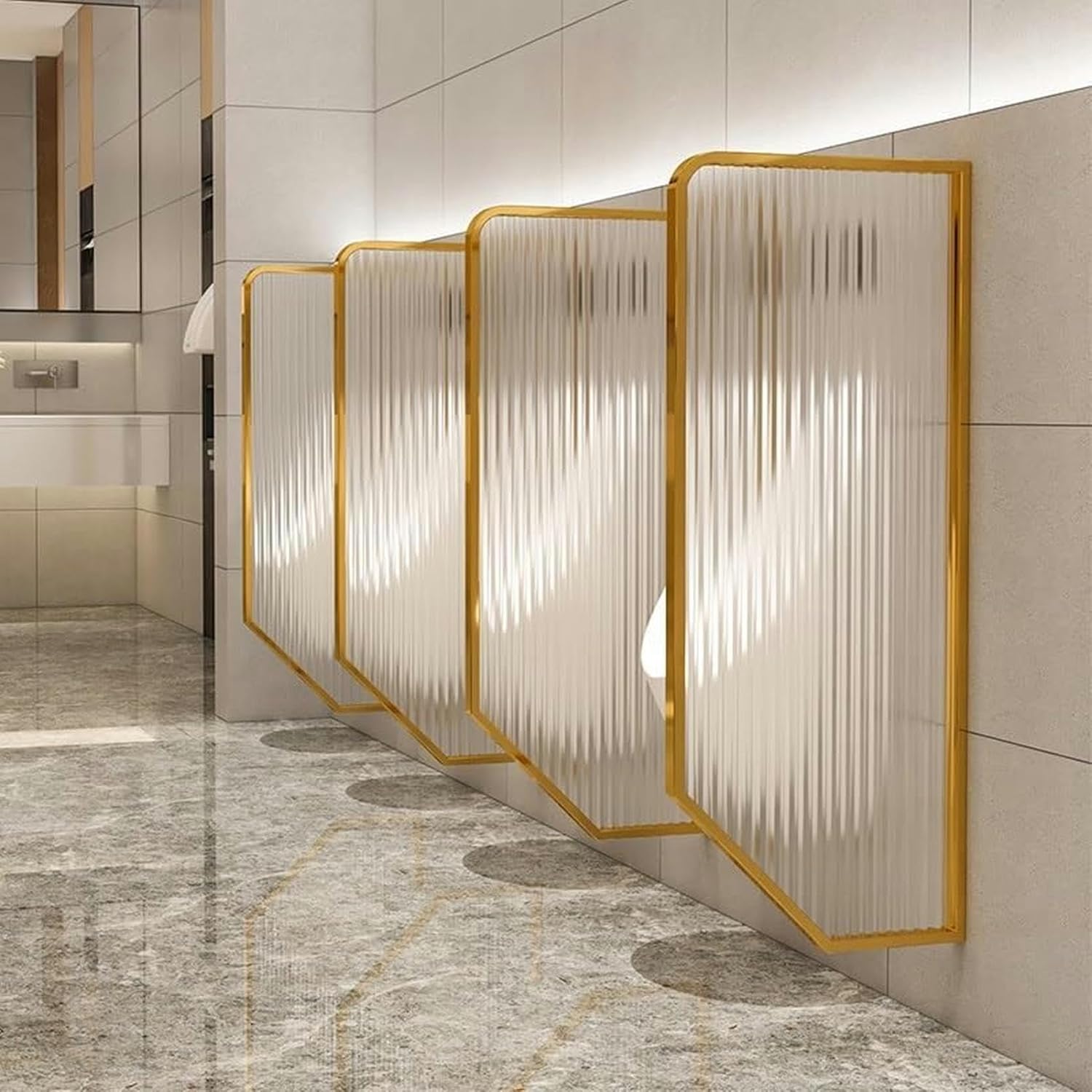 Product Name: urinals partition for men,home improvement screen,urinals privacy screen for men toilet,restroom partitions,wall urinal screen toilet partition,toilet accessories,wall urinal screen toilet partitionMaterial: Tempered Glass + Stainless Steel FrameDesign: Semi-Transparent DesignSize: 120*40cmCraftsmanship: Baking Paint CraftColors: Black, Gold, Silver, Rose GoldStyle: Modern LuxuryScenarios: Hotels, Shopping Malls, Exhibition Halls, Conference Venues, Restaurants, and other high-end establishmentsUpgrade your restroom with our premium Urinal Partition Divider featuring a durable stainless steel frame. Crafted for superior quality and functionality, this Wall-Mounted Urinal Partition Divider ensures optimal privacy and hygiene in any bathroom, hotel, or public facility. Designed with convenience in mind, this Urinal Privacy Screen is easy to install and maintain, offering a hassle-free solution to enhance user comfort.Experience discretion and style with our Urinal Divider Screen Panel. Its sleek and modern design seamlessly blends into any restroom environment, adding a touch of sophistication while ensuring essential privacy. Say goodbye to awkward encounters and hello to peace of mind with this innovative solution.Maximize floor space and promote cleanliness with this Men's Urinal Privacy Screen. Its wall-mounted design not only saves space but also facilitates efficient cleaning, making it an ideal addition to busy restroom settings. Elevate the standard of your facilities and prioritize user satisfaction with our Urinal Partition Divider.Invest in quality and sophistication today. Upgrade your restroom experience with our Urinal Partition Divider and transform your space into a haven of comfort and discretion.