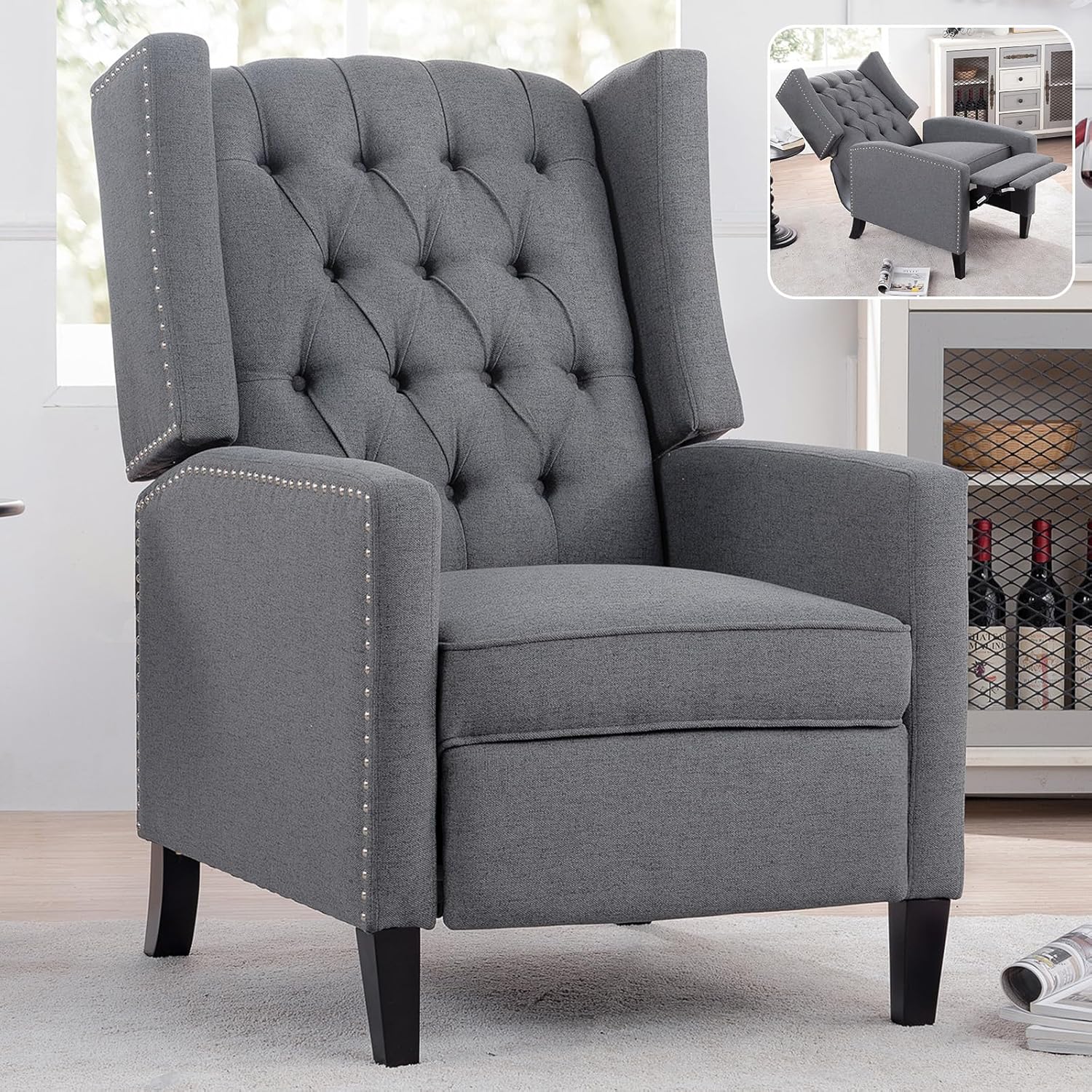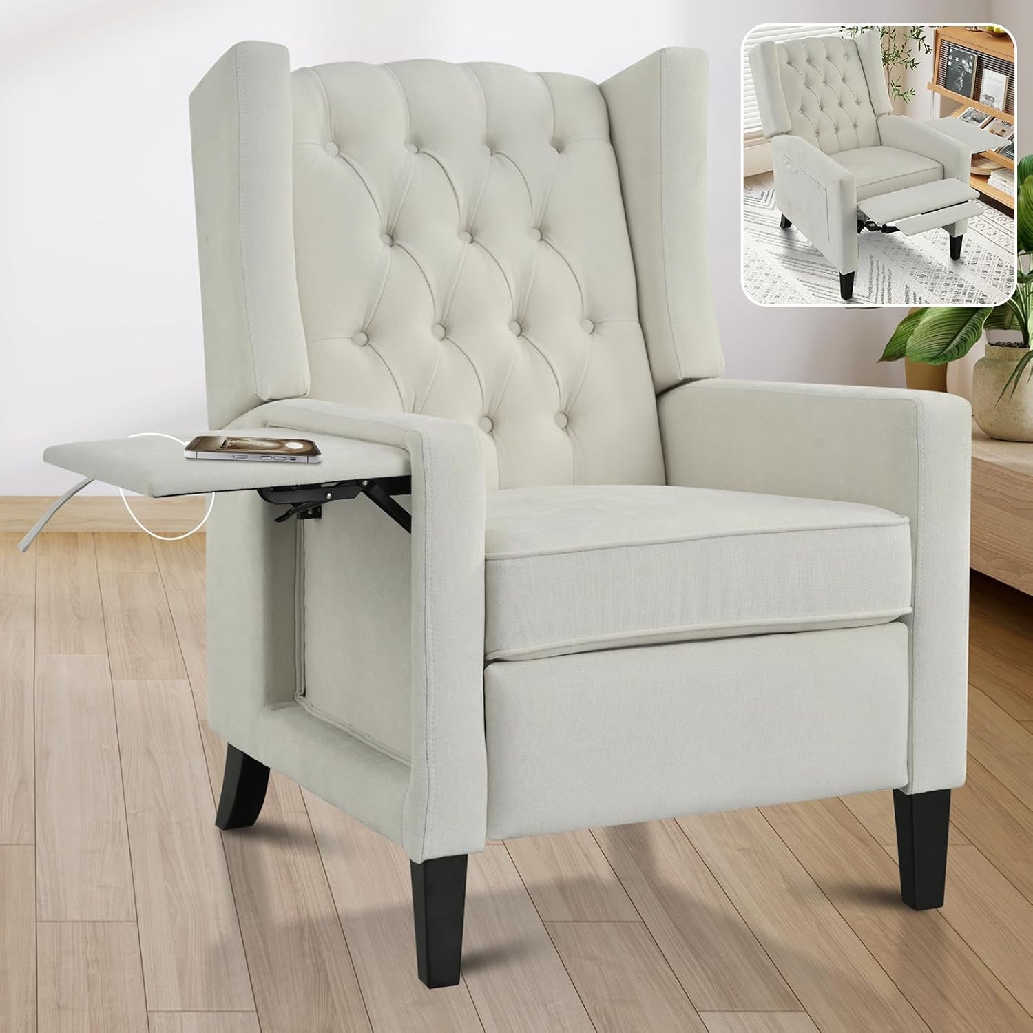 Modern Recliner Chair with Push-Back Relaxation & Smart FeaturesExperience ultimate comfort with our mid-century modern recliner chair, designed to blend style, functionality, and relaxation. Whether you’re reading, napping, or watching movies, this small recliner for small spaces delivers ergonomic support and convenience with its extended footrest, foldable side table, and built-in charging ports.Why You’ll Love This Recliner Chair✔ Effortless Push-Back RecliningSmooth manual operation – Lean back to activate the 90°-160° reclineExtended footrest – Supports legs fully for zero-gravity comfortNo heavy lifting – Perfect for adults seeking easy-to-use recliners✔ Mid-Century Modern DesignButton-tufted diamond stitching – Adds vintage charm to any roomWingback silhouette – Provides head and neck supportCompact footprint (29.13"W x 35.43"D) – Fits small spaces like apartments or bedrooms✔ Smart Convenience FeaturesFoldable side table – Holds drinks, books, or remotes (folds down when not in use)Dual charging ports (USB + Type-C) – Keep devices powered while loungingScroll-style armrests – Wider for enhanced comfort✔ Sturdy & Safe ConstructionSolid wood frame + metal mechanism – Supports up to 220 lbsStable base – Prevents tipping during recliningHigh-quality foam padding – Retains shape over time✔ Quick Assembly & Versatility10-minute setup – Attach legs and ready to useMulti-room use – Ideal for living rooms, bedrooms, or home theatersNeutral black upholstery – Matches modern, industrial, or rustic decorTechnical SpecificationsUpright Dimensions: 29.13"W x 35.43"D x 39.76"HSeat Size: 20.08"W x 20.28"DSeat Height: 18.11"HWeight Capacity: 220 lbsMaterials: Faux leather, solid wood, metal mechanismIdeal For:✅ Small spaces – Apartments, studios, or cozy corners✅ Movie enthusiasts – Perfect for home theater seating✅ Readers & nappers – Recline comfortably for hours✅ Tech users – Charge devices without leaving the chair✅ Modern decor lovers – Elevates mid-century, industrial, or minimalist stylesCompare to Big Brands, Without the Price TagMore functional than basic recliners – Includes table + charging portsMore stylish than traditional La-Z-Boy designs – Modern tufted detailsMore affordable than electric models – Manual operation reduces costUpgrade Your Relaxation Today!Don’t settle for bulky, outdated recliners. This compact, feature-packed chair offers luxury comfort at an accessible price.En Español:Sillón Reclinable Moderno con Puerto de CargaInclinación manual suave (90°-160°)Brazo plegable con mesa para bebidasPuertos USB and Type-CPerfecto para espacios pequeños¡Relájese con estilo y comodidad!