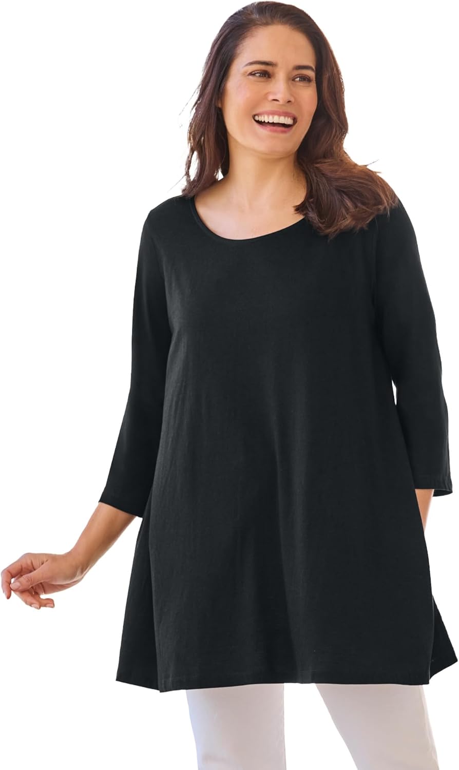 A timeless and flattering tunic with an easy swing silhouette to flow with you all-day. This three-quarter sleeves and scoop neckline tunic has side-seam pockets. Dress it up for dinner to a night out on the town. 30" length br> Swing silhouette br> Side-seam pockets for your essentials br> Three-quarter sleeves br> Cotton/rayon knit; imported br> Machine wash