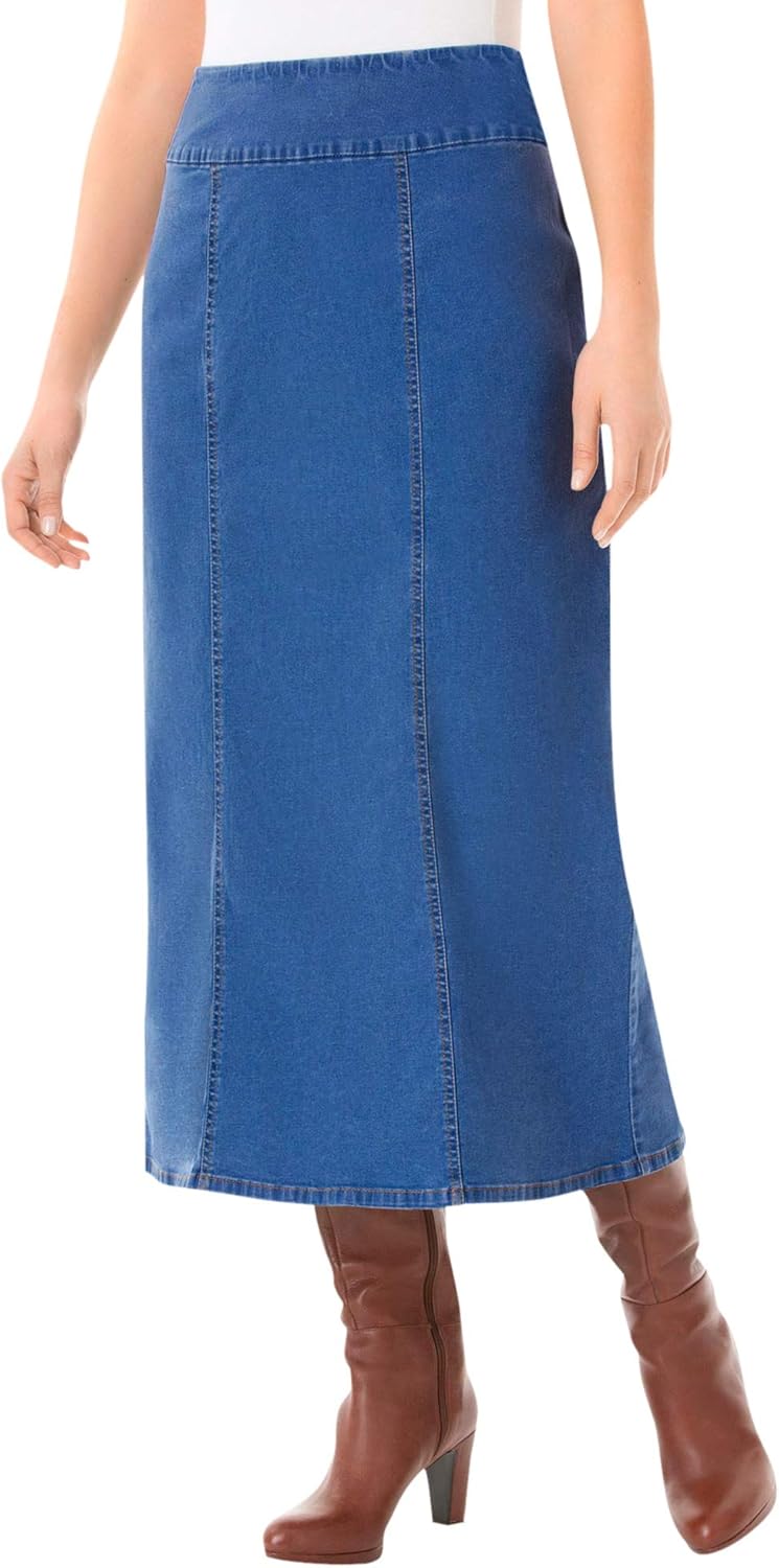 This easy, A-line denim jeans skirt is designed with a full, flat, covered elastic, no-gap waistband that lies flat against the body to provide a smooth look under all your favorite tops and tunics. Enjoy the classic look of a great pair of jeans but move comfortably thanks to allover stretch. Crafted with a full flat, covered elastic waistband that lies smoothly on your waist, perfect for all-day wear. br> The mock fly ensures a sleek look under your favorite tops and tunics, enhancing your silhouette. br> Lies flat under your tops and sits right over your hips. br> Enjoy the freedom of movement with soft stretch denim that adapts to your body while providing a relaxed yet secure fit. br> Available in Average (34" inseam), Petite (32" inseam); sizes to suit every body type. br> Made from a durable blend of cotton, polyester, and spandex for long-lasting wear. br> Machine washable for easy care and maintenance. br> Imported.