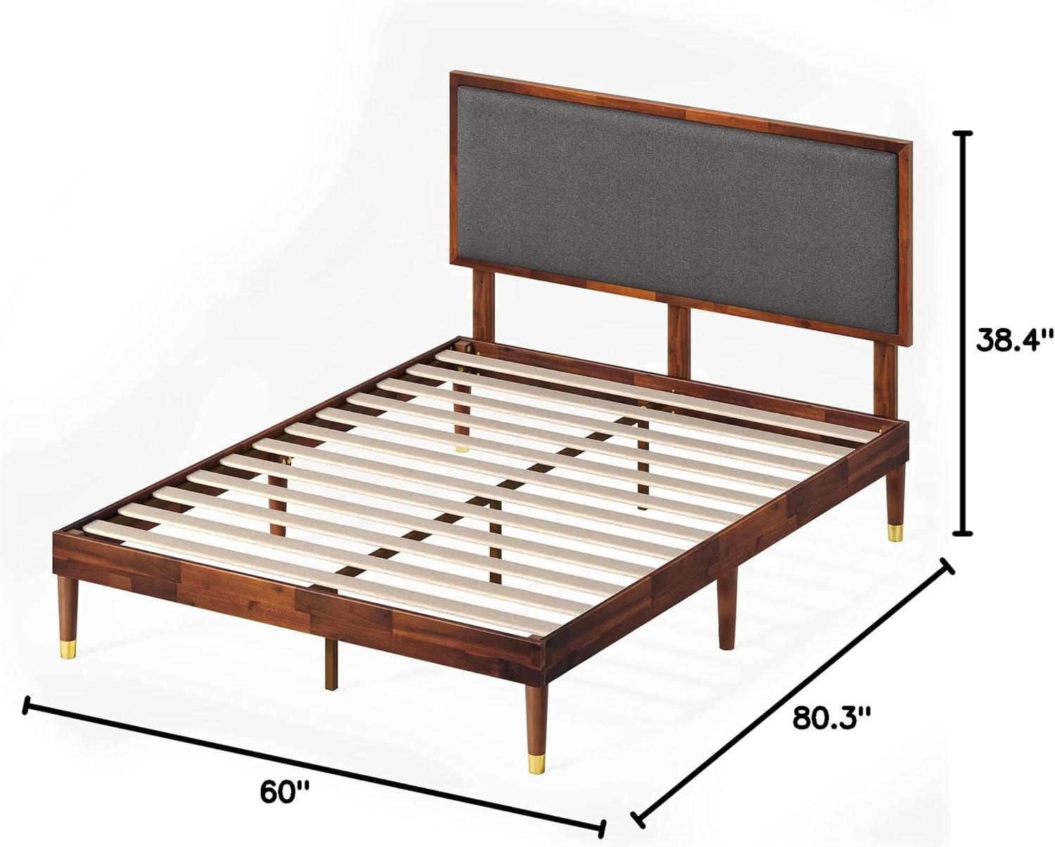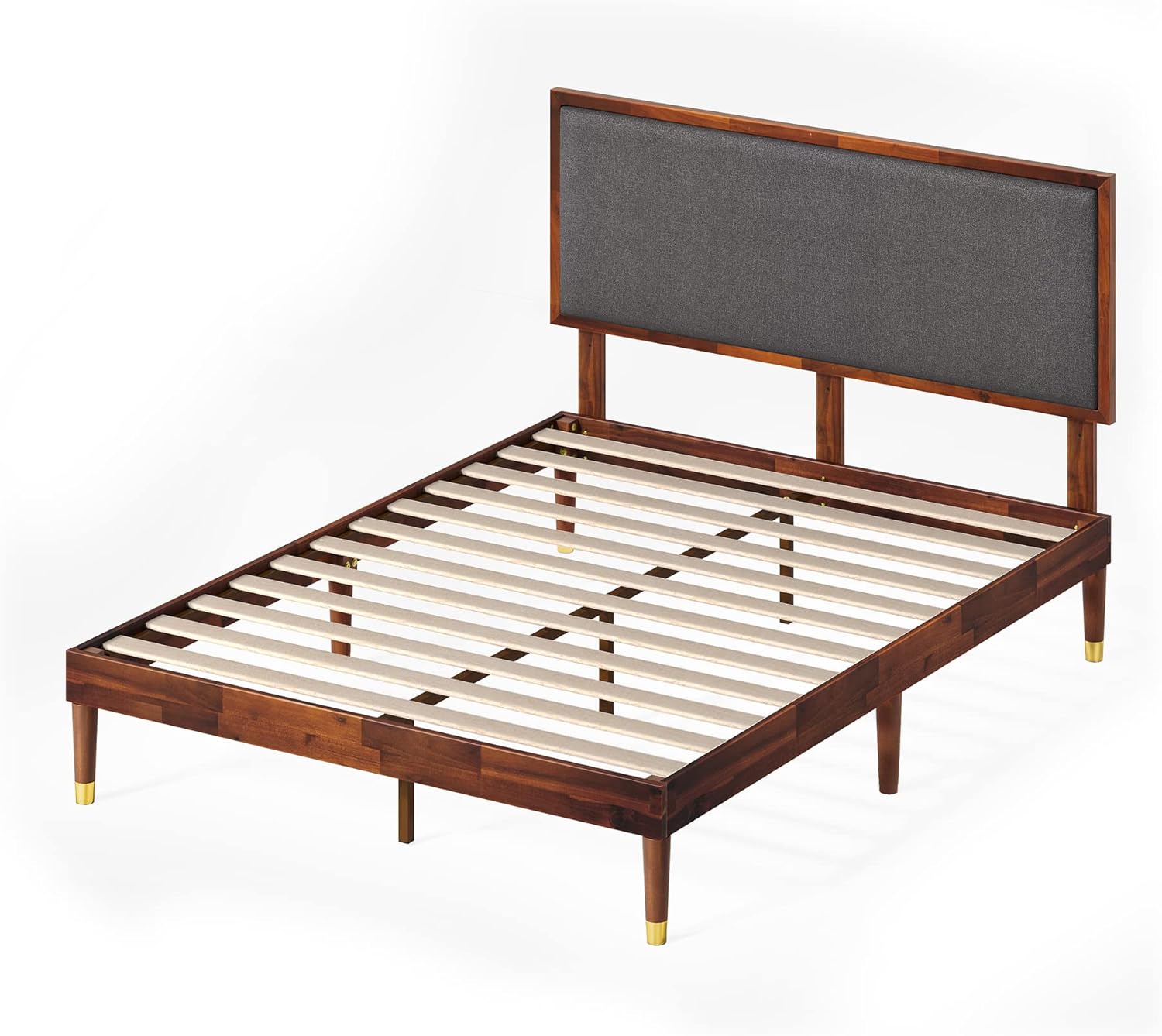 Made to improve both the look of your room and your night’s sleep, the Raymond Wood Bed with Upholstered Headboard combines beautiful solid wood and cozy upholstery into one elegant bedroom centerpiece. Designed with an exquisite mid-century style, this handsome frame features a deep finish with organic wood grain and tapered, brass tipped legs for a polished feel. Its grey upholstered headboard softens the look and comfortably cushions your back while sitting up in bed. The headboard has an adjustable height that can be customized during assembly to perfectly suit the thickness of your mattress. Built with a reliable wood platform, Raymond is designed to durably support you and your mattress without a box spring. The whole thing is skillfully packed into one box and shipped to your door with everything needed to assemble it, like handy tools and step-by-step instructions. Get ready to enjoy your bedroom more than ever before with this sophisticated foundation.
