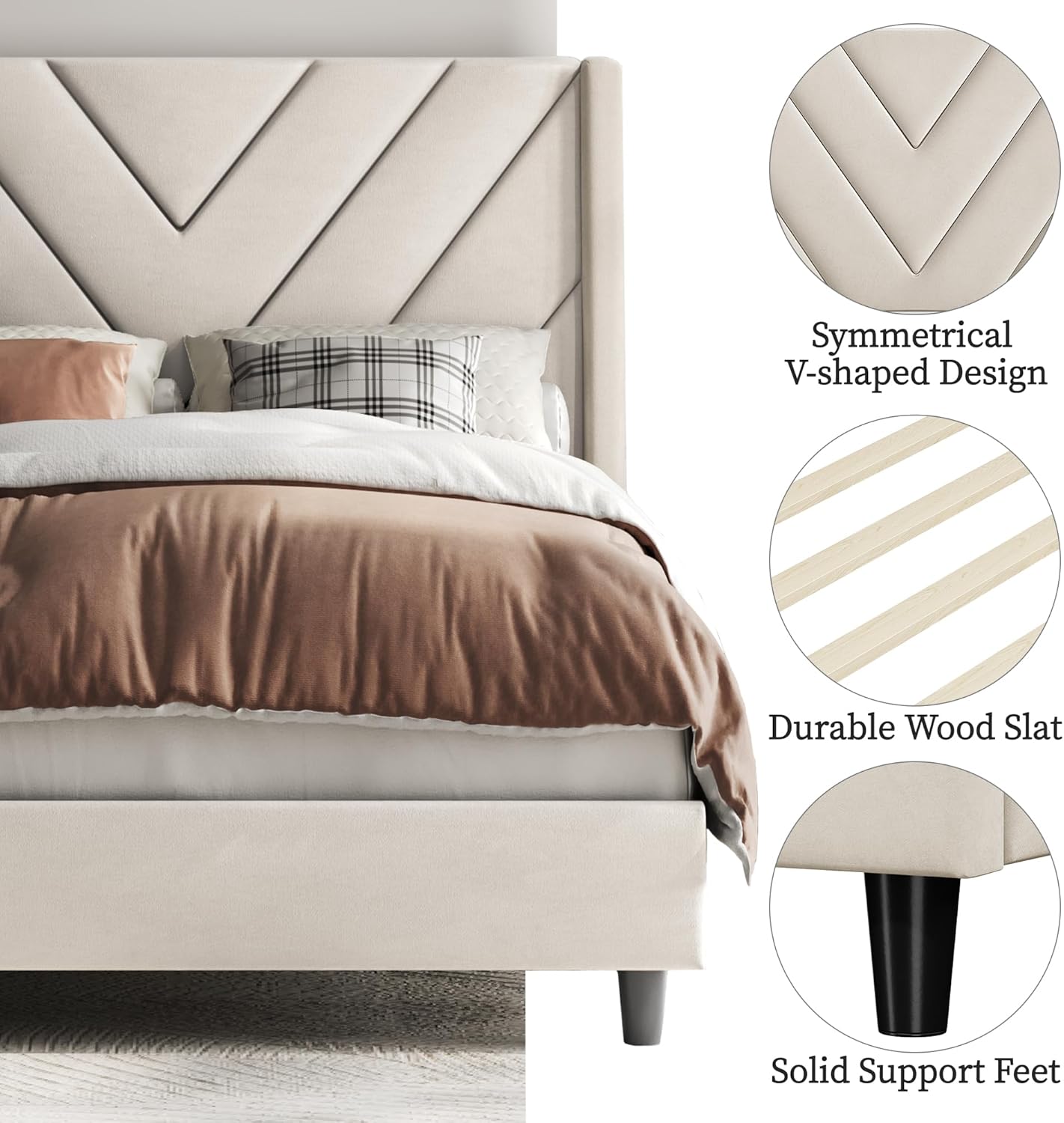 • Ideal Complement: This bed frame with wooden supportblends cozy comfort with a foam-padded headboard, elevating your room with its symmetrical geometric shape, soft tone, and elegant winged design detail. A perfect balance of style and comfort